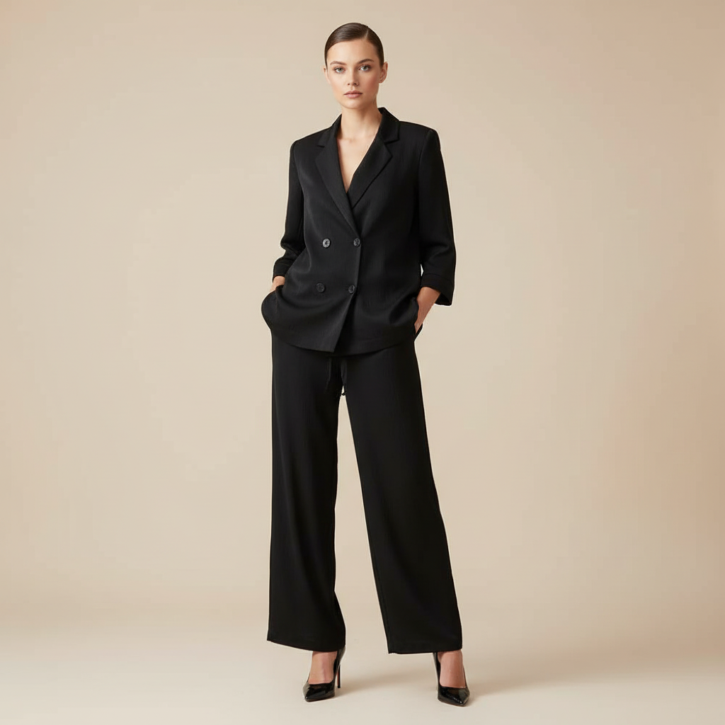 Alliez sophistication et confort avec ce modèle d'ensemble satiné composé d’un blazer à double boutonnage et d’un pantalon fluide. Son tissu brillant et sa coupe élégante font de ce duo le choix idéal pour une tenue raffinée, que ce soit pour une soirée habillée ou une occasion spéciale.