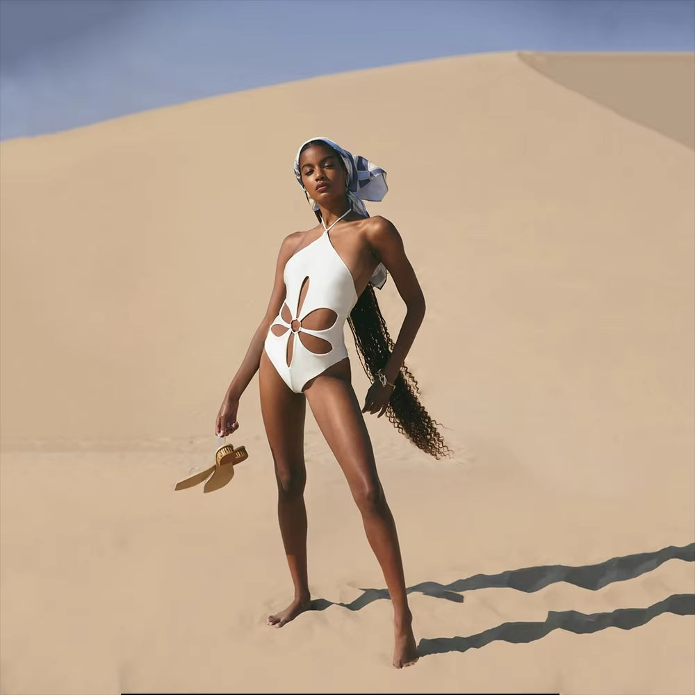 ✨ Faites sensation cet été avec notre maillot une-pièce à découpes graphiques, dos nu et col halter.