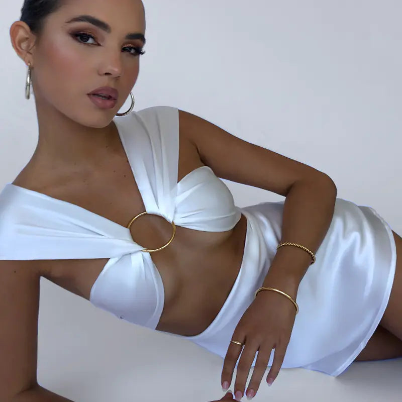 Elle présente une coupe fluide, un ourlet séduisant et des anneaux dorés qui permettent de nouer et styliser la robe selon vos envies.